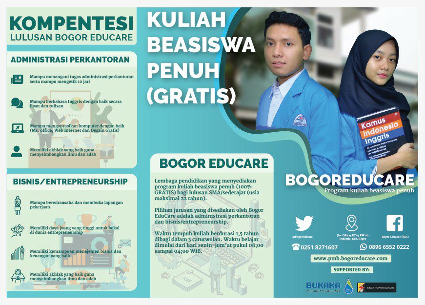 Maka dari itu Bogor EduCARE (BEC) hadir sebagai solusi untuk masyarakat yang memang pada kenyataannya kekurangan ekonomi namun memiliki semangat dan kemauan tinggi untuk terus belajar demi meraih impian. Bogor EduCARE adalah salah satu kampus yang berdomisili di daerah Bogor dimana kampus ini sudah menjalani tahun ajaran 2020/2021 atau angkatan yang ke-24. Kampus Bogor EduCARE menyediakan beasiswa penuh untuk calon mahasiswa baru yang memang sesuai dengan apa yang telah menjadi persyaratannya.